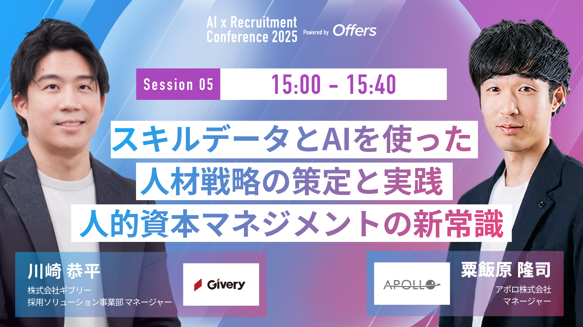 人事データ活用セッションでは、アポロ株式会社 マネージャー 粟飯原 隆司 氏、株式会社ギブリー 採用ソリューション事業部 マネージャー 川崎 恭平 氏をお迎えし、AI時代の採用・組織構築の最前線に迫ります。